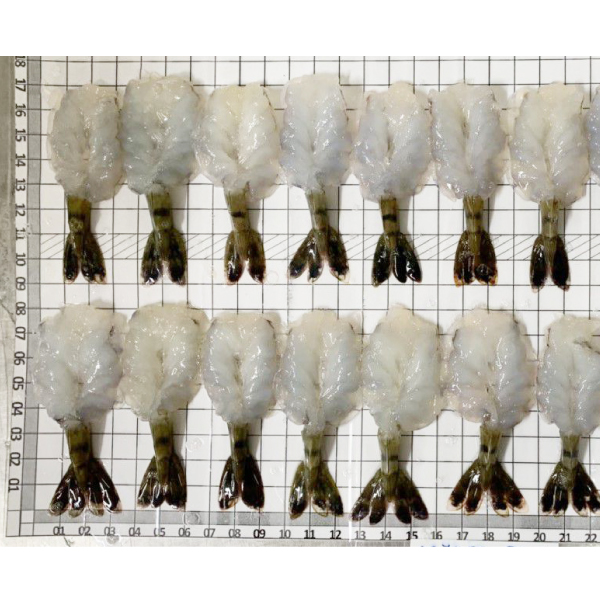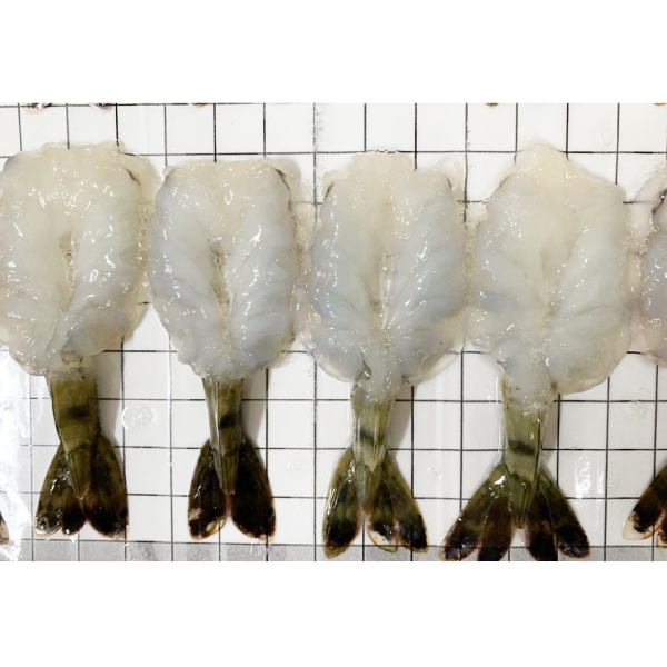 - Raw Back Tiger Shrimp, Peeled & Deveined Tail On, Butterfly-cut, tray-ing.